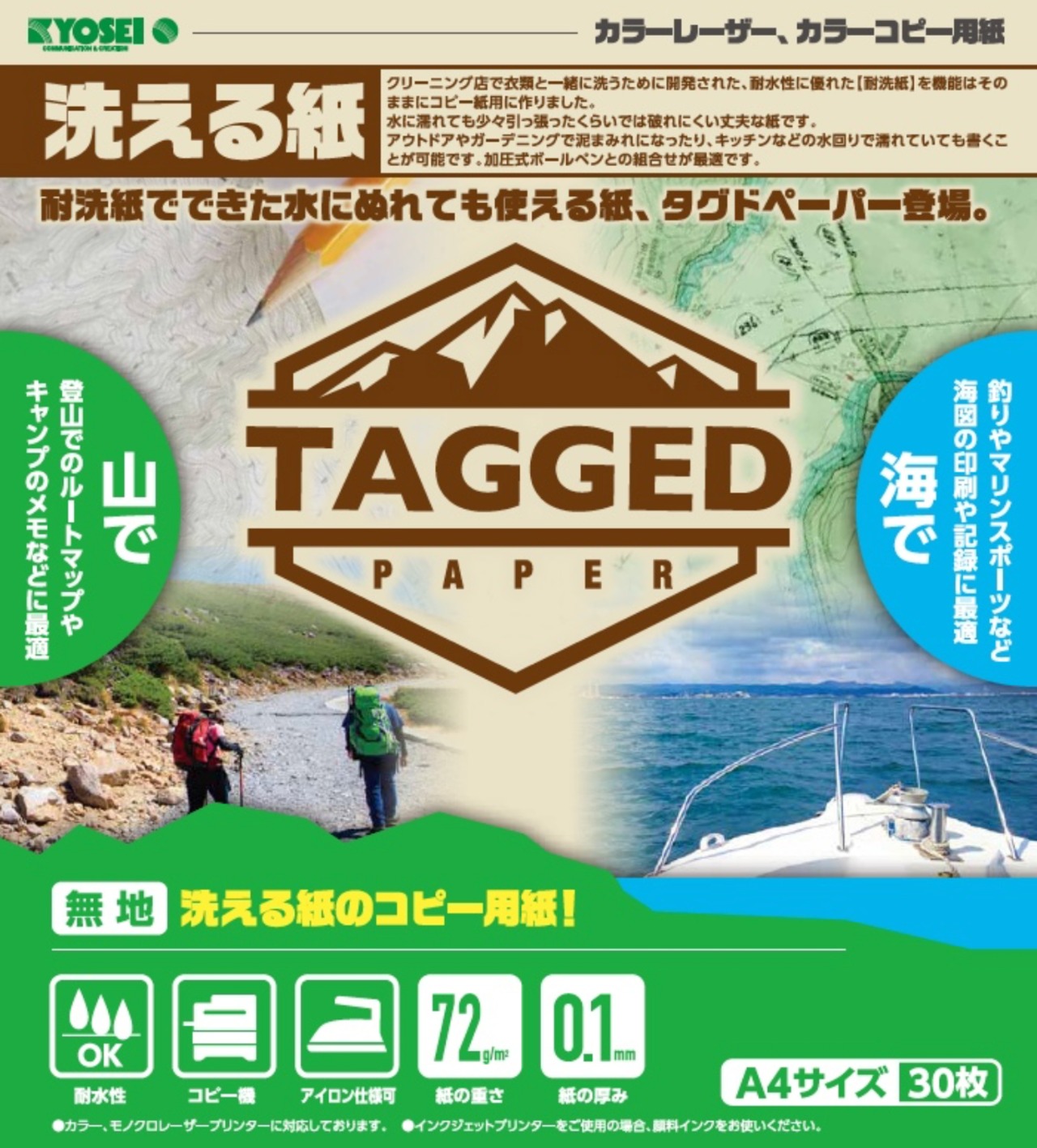 革新的な機能を持つコピー用紙が登場しました!【TAGGED PAPER】は、従来のコピー用紙に洗える特性をプラスした、特別な製品です。クリーニング店での使用を想定して開発された耐水性に優れた紙なので、水に濡れても安心して使用できます。少々の引っ張りにも耐える丈夫さが特徴で、どんなシーンでも確実に記録ができます。